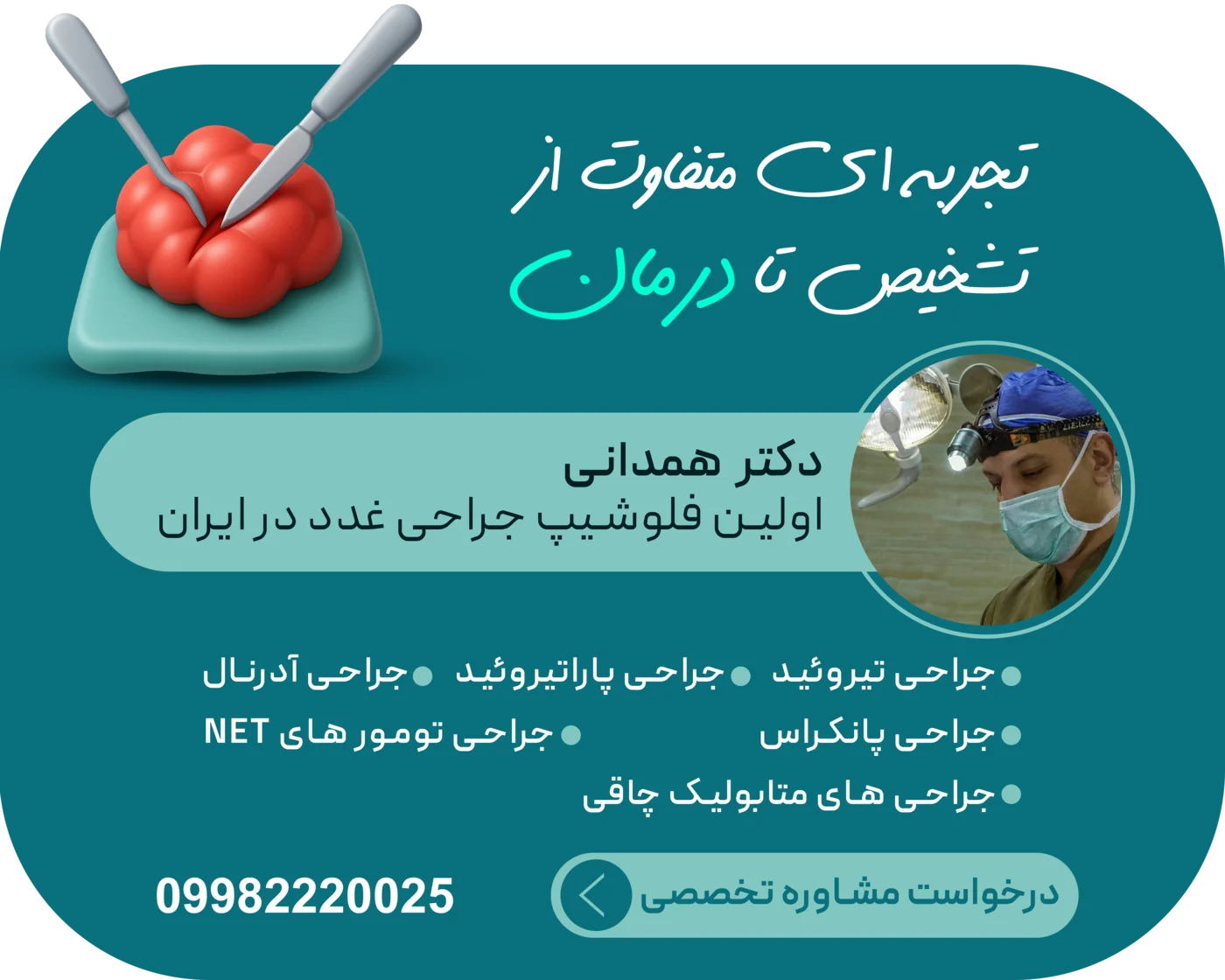 دکتر کاوه همدانی، فلوشیپ جراحی غدد درون ریز با تجربه، از پیشگامان این حوزه در ایران است که با تکیه بر دانش تخصصی، سالها تجربه بالینی و بهرهگیری از تکنیکهای نوین جراحی، خدماتی دقیق و کمتهاجمی در درمان بیماریهای تیروئید، پاراتیروئید، آدرنال و تومورهای نورواندوکرین ارائه میدهد.